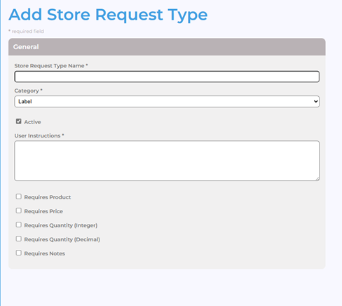 • Navigate to Inventory Mgmt > Store Request Items > Manage Request Types > Add New