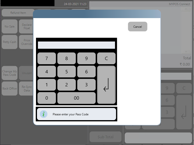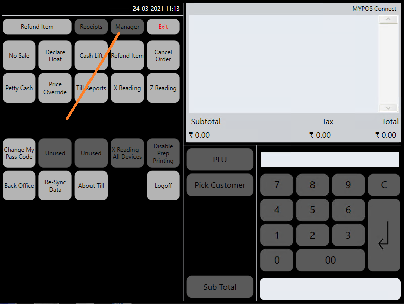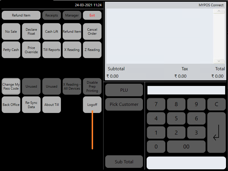 To Pick up the code change MYPOS will need restarting on each iPad, to do this select 'Manager' then 'LogOff' and Double Click on the MYPOS8 Icon.