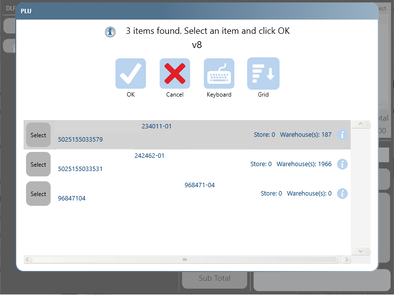 Start typing some information about the product, for example the product description, the barcode or the product code, as you type results which match will appear