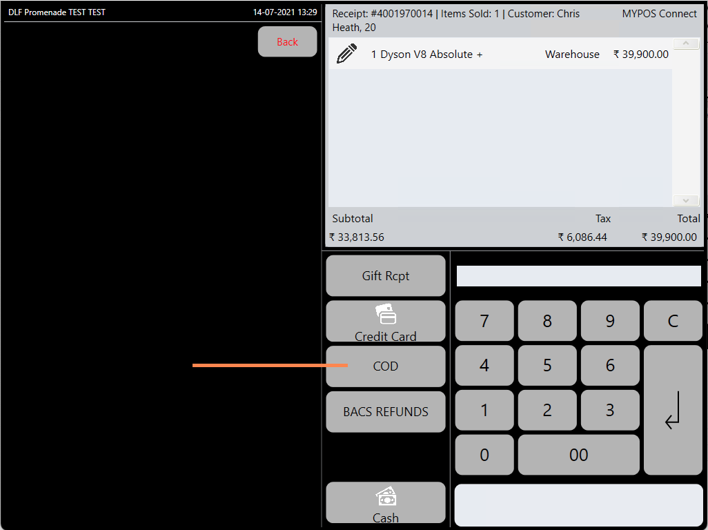 As a COD payment is only available for home delivery orders the sale must have a customer added to it , press the "COD" button and a pop up screen will appear allowing you to select a Receipt Printer to use for stores with more than one receipt printer