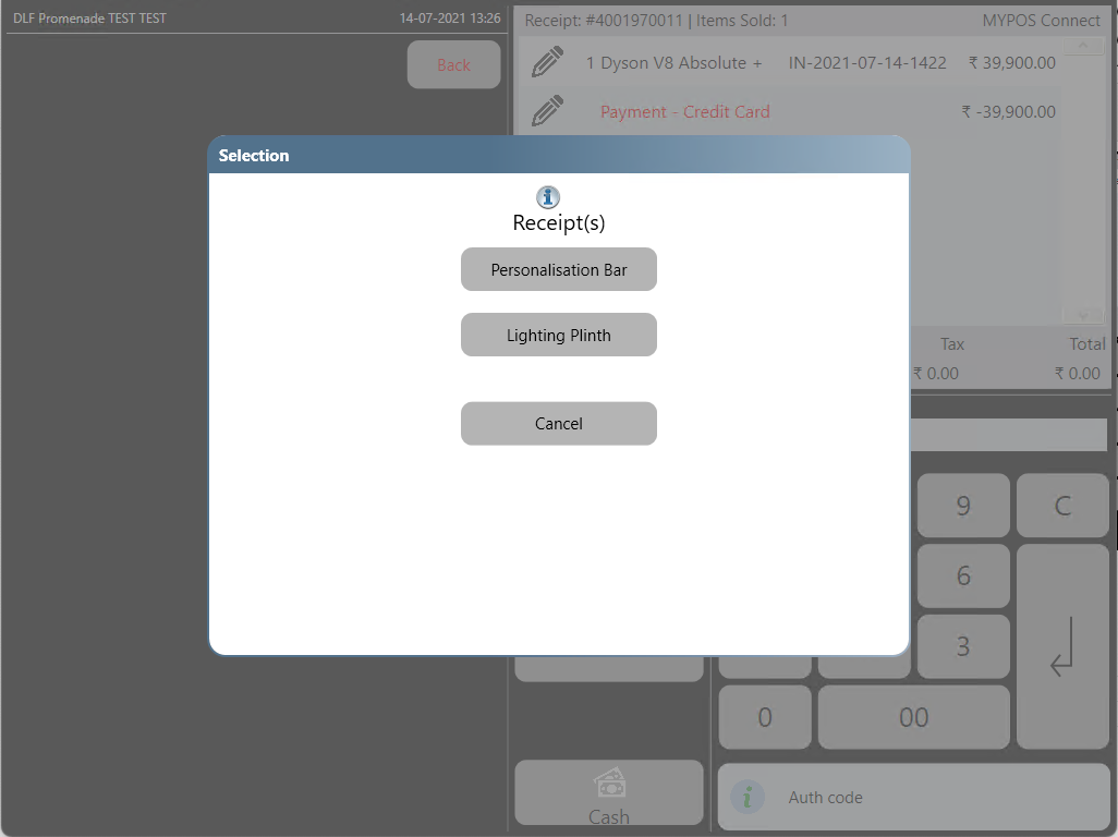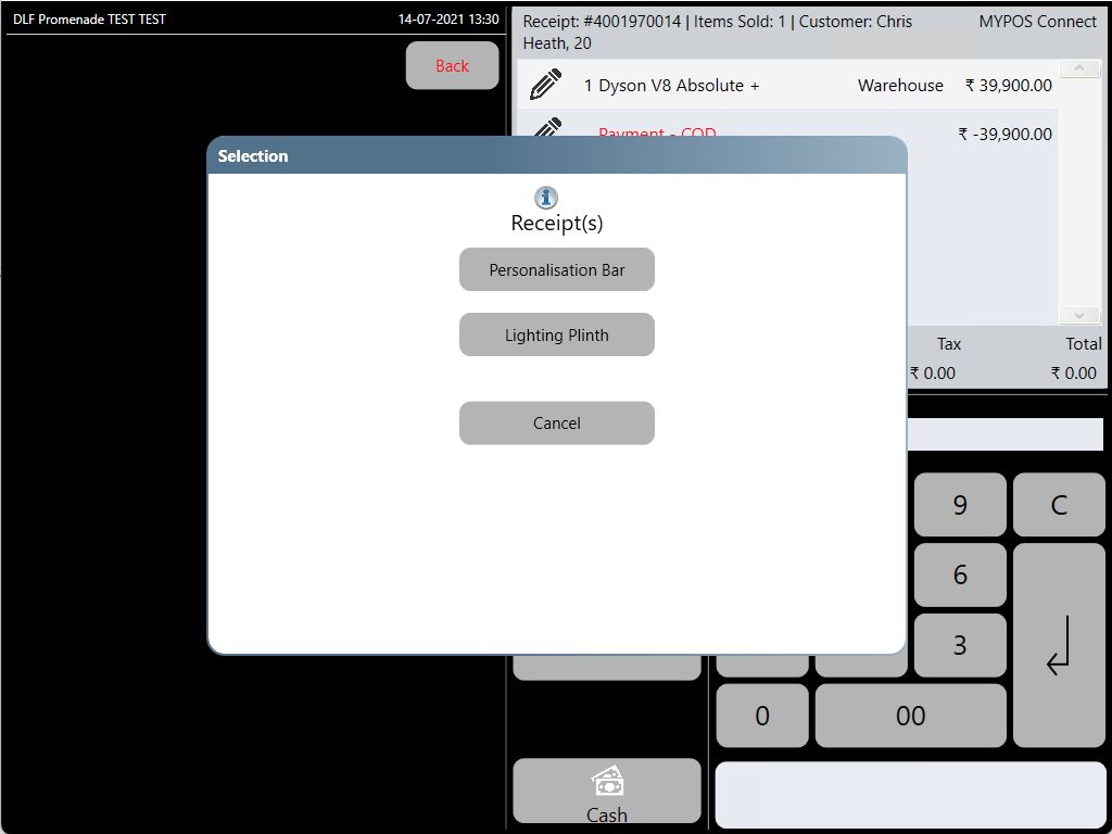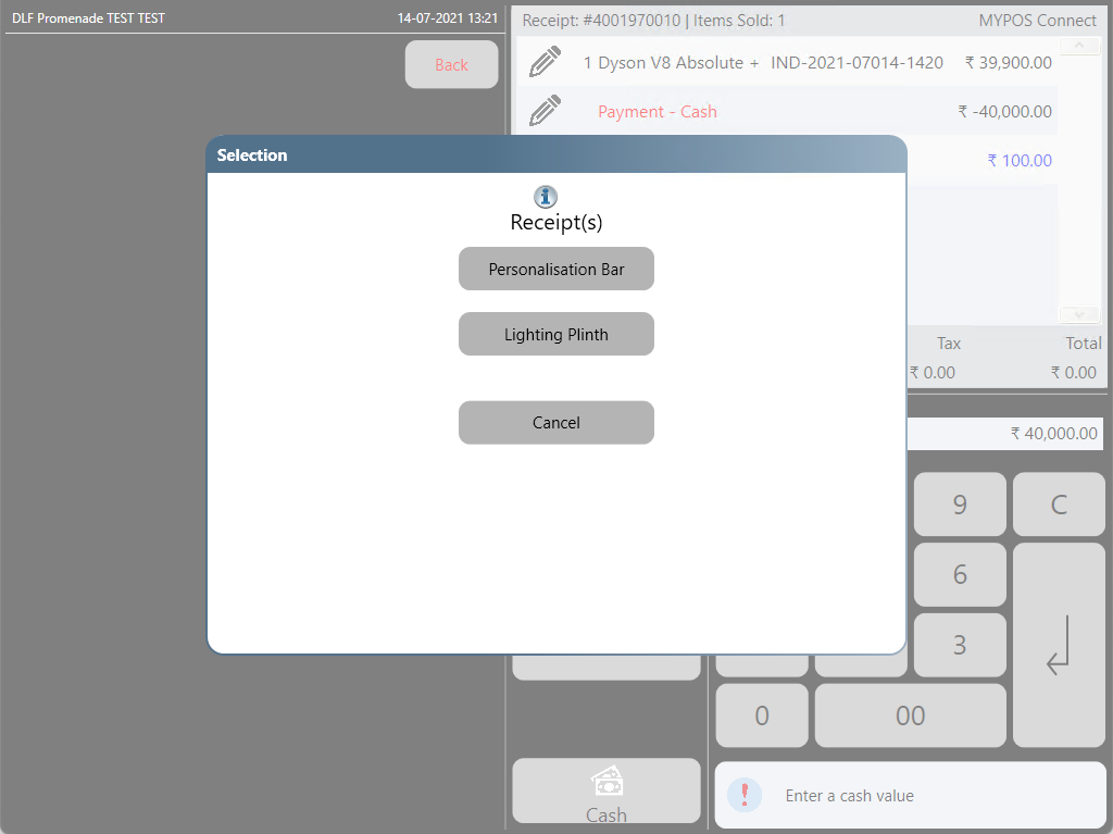 If the customer is paying Cash, type in the amount of cash the customer has given you into MYPOS using the keypad on the MYPOS screen and the press the 'Cash' payment button, if your store has more than one cash drawer and/or more than one receipt printer a pop up window will appear to let you select firstly the Receipt Printer then the Cash Drawer you want to use for the sale.