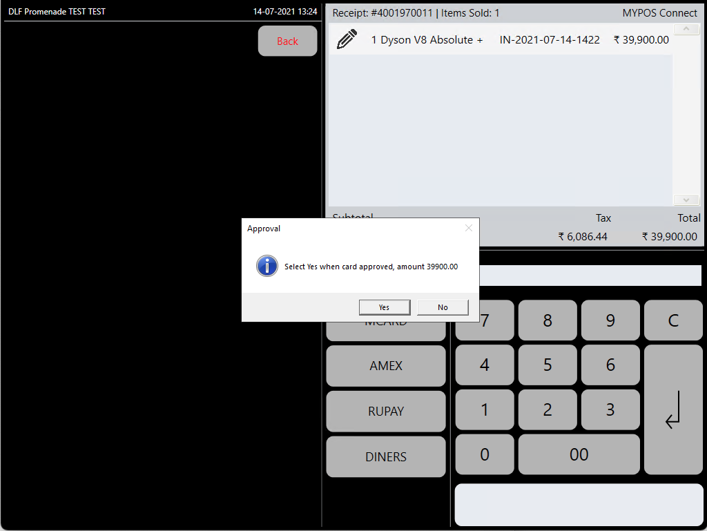A Pop up will appear asking you to confirm the payment amount is correct, check this against the merchant copy of the receipt, press 'yes' if correct