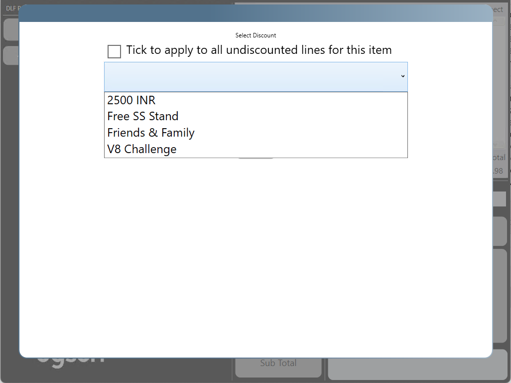 The List of available discounts for the product you have selected will be displayed in a drop down list, not all discounts can be applied to all products, discounts may be restricted to specifc products or classes of products, if a price override or a promotion has already been applied to the item then no further discount options will show