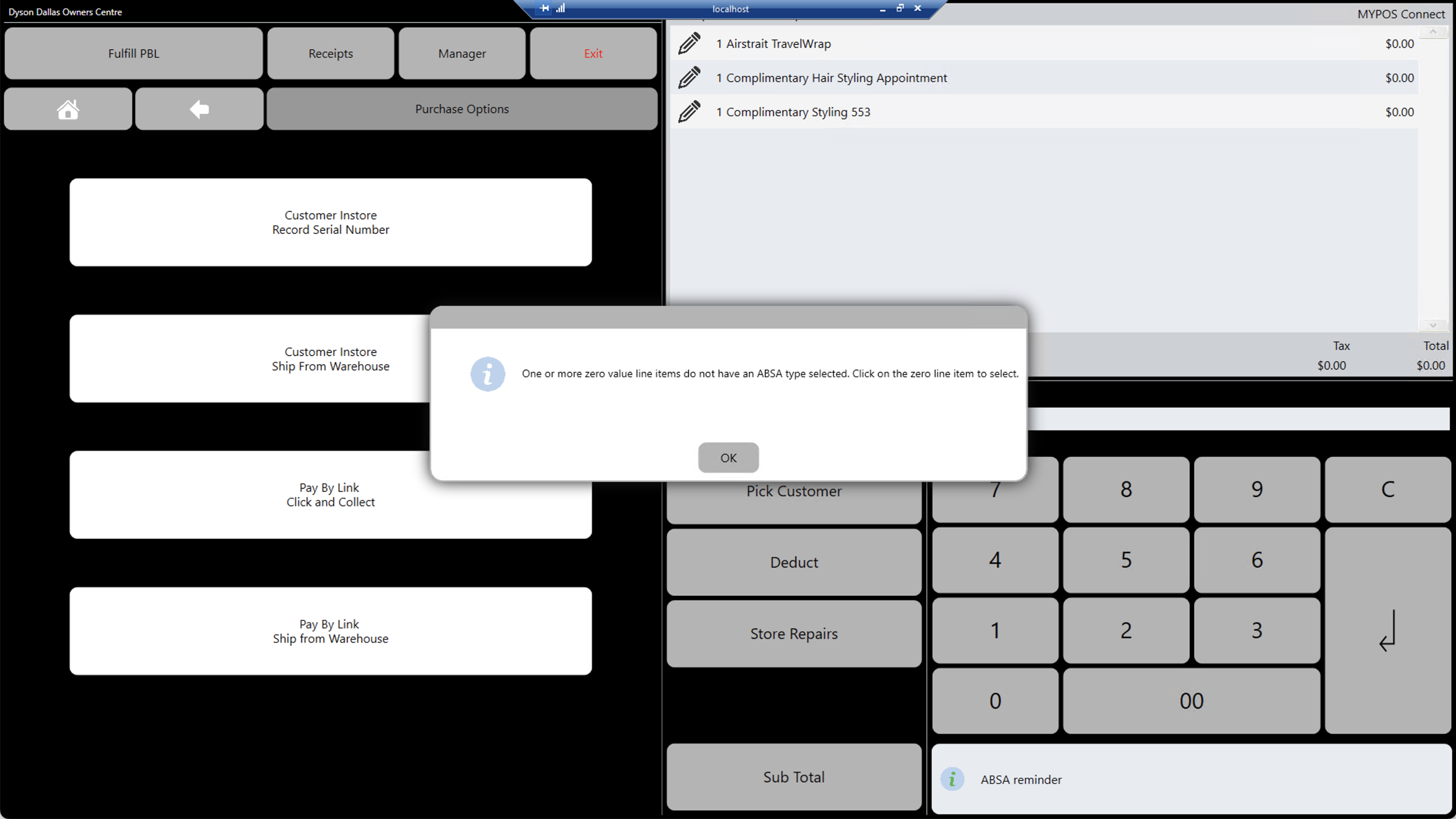 if you have not added a ABSA reason to any zero valued line the below message will appear when pressing Sub Total