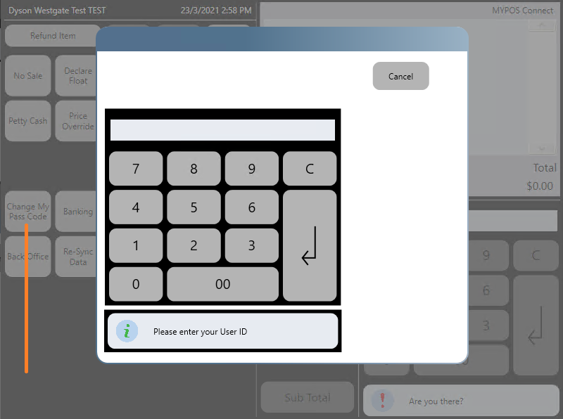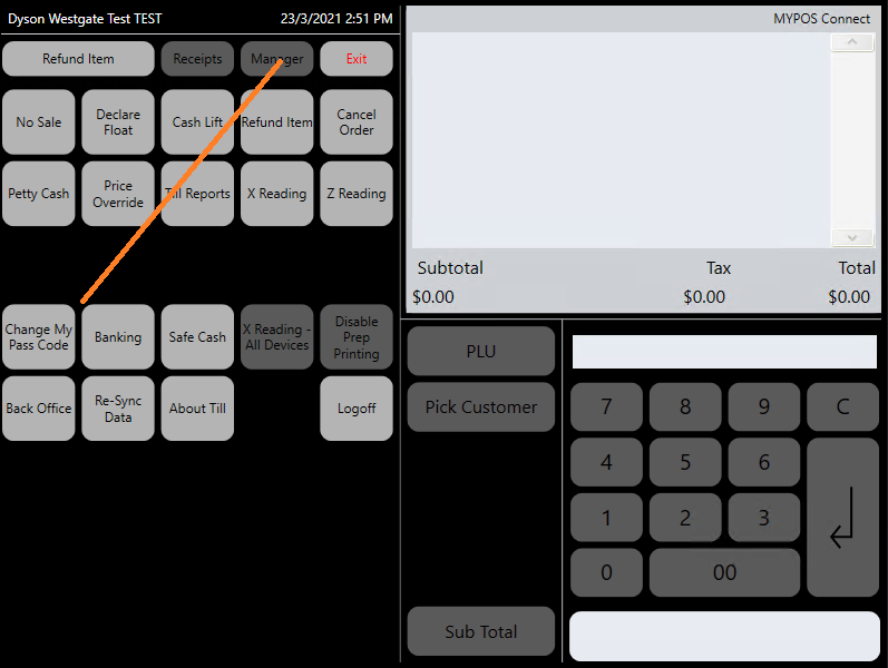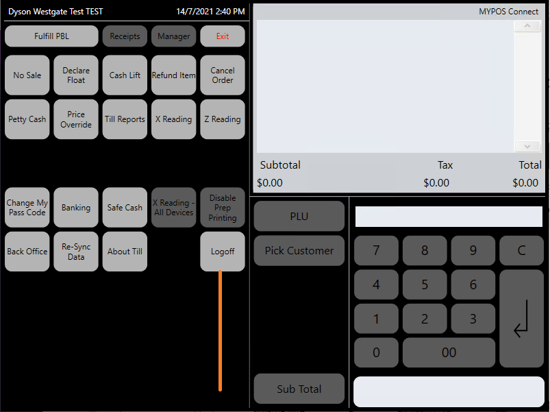 To Pick up the code change MYPOS will need restarting on each iPad, to do this select 'Manager' then 'LogOff' and Double Click on the MYPOS8 Icon.