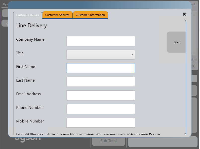 Then fill out the customer's details, proceeding through each tab either by pressing 'next' or by selecting the next tap from the top of the screen,