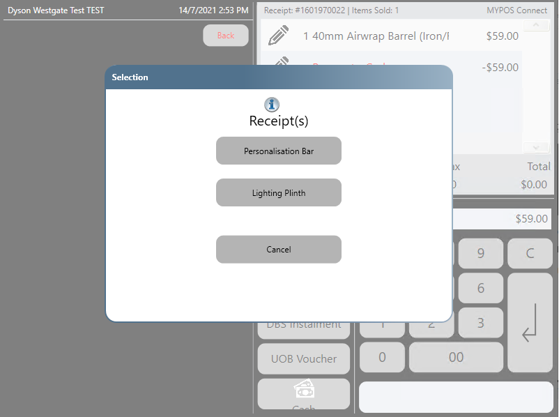 If the customer is paying Cash, type in the amount of cash the customer has given you into MYPOS using the keypad on the MYPOS screen and the press the 'Cash' payment button, if your store has more than one cash drawer and/or more than one receipt printer a pop up window will appear to let you select firstly the Receipt Printer then the Cash Drawer you want to use for the sale.