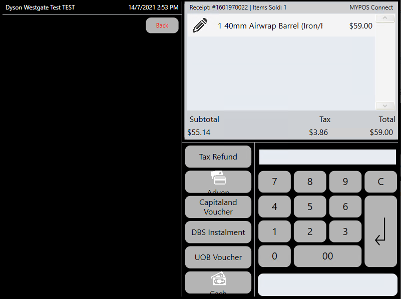 The Payment amount will be send to the Adyen device automatically, the customer should then follow the prompts on screen on the Adyen device to complete payment via Credit Card/Digital Wallet, once the payment is complete the customer will be prompted to remove their card (if applicable) and a customer and merchant copy of the receipt will be printed.