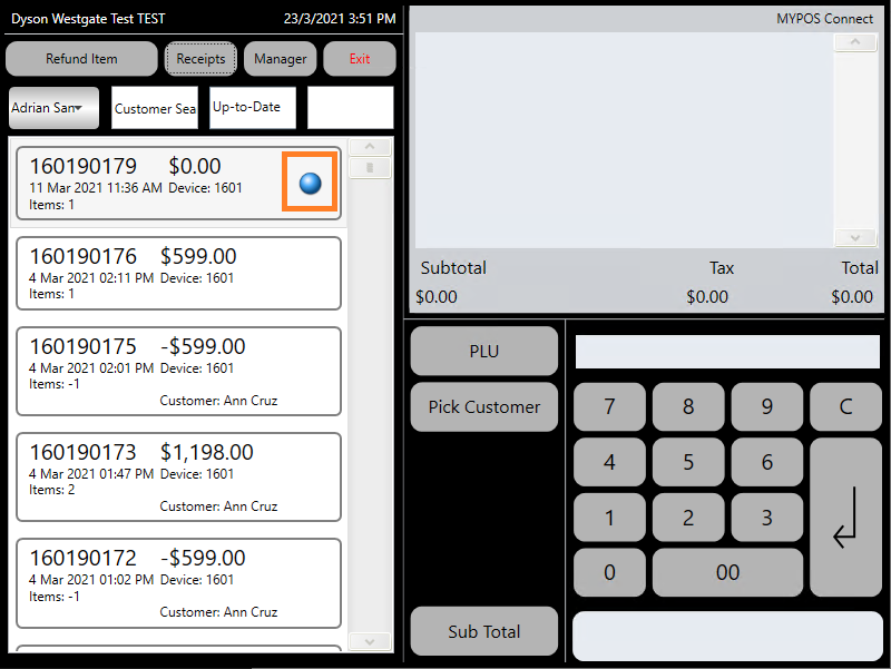 Once you have located the correct receipt, press the small blue dot on the right hand side of the receipt to load the refund options