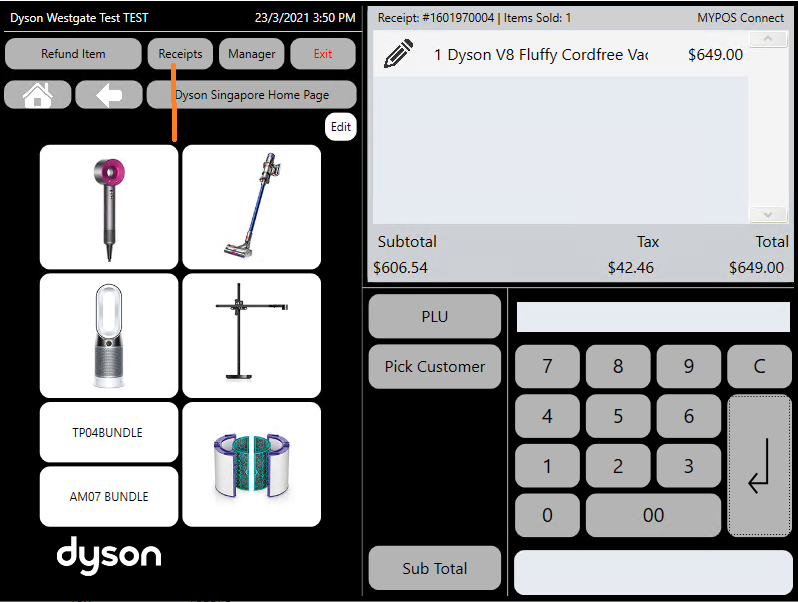 alternatively if the customer doesn't have the receipt you can look up the receipt manually by selecting the 'Receipts' button from the Main Menu Page