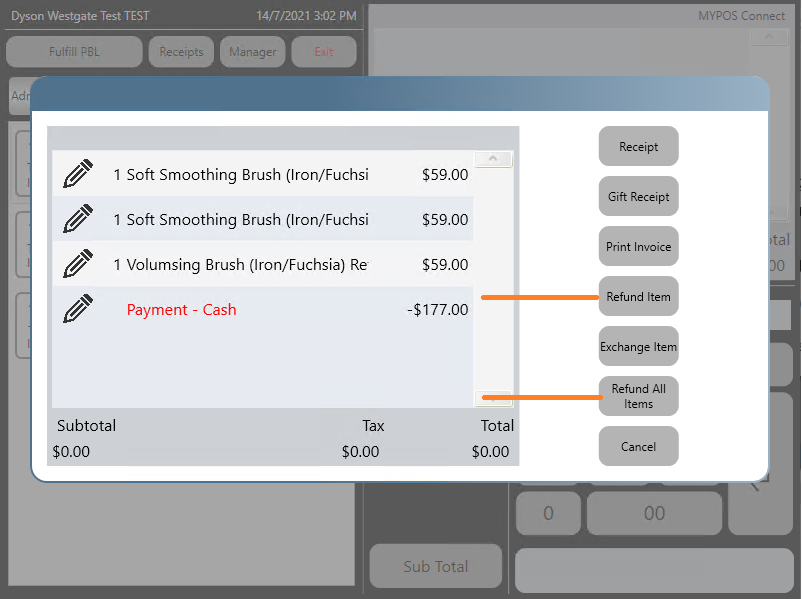 To Refund multiple items on the receipt or all items press the 'Refund All' button