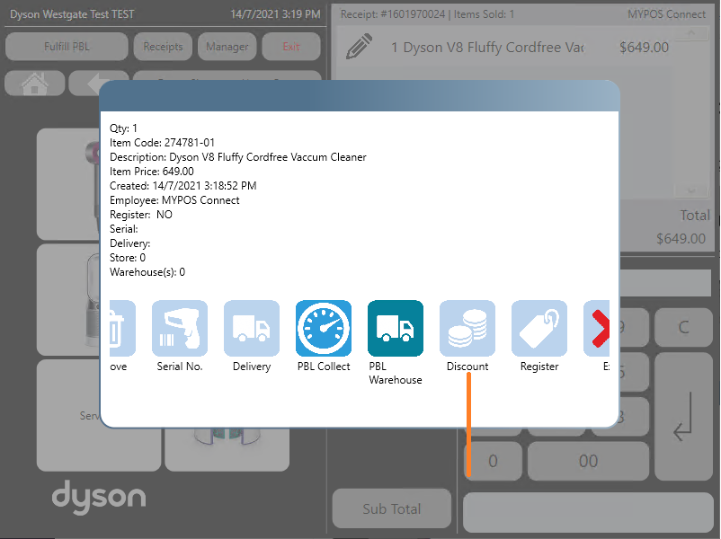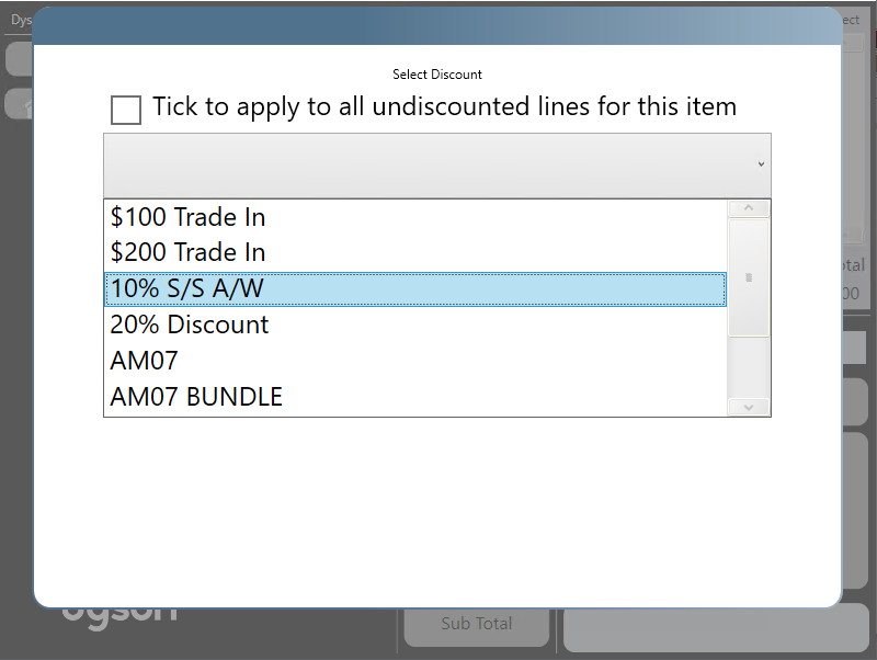 The List of available discounts for the product you have selected will be displayed in a drop down list, not all discounts can be applied to all products, discounts may be restricted to specifc products or classes of products, if a price override or a promotion has already been applied to the item then no further discount options will show