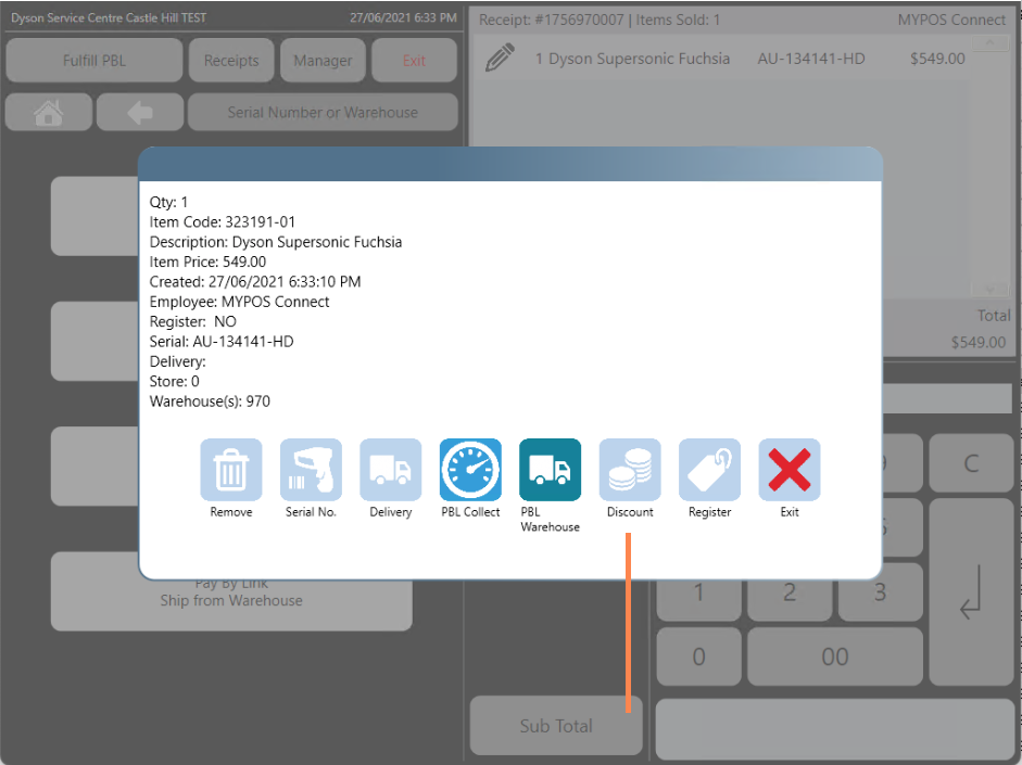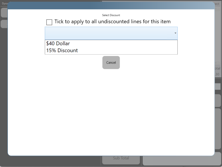 The List of available discounts for the product you have selected will be displayed in a drop down list, not all discounts can be applied to all products, discounts may be restricted to specifc products or classes of products, if a price override or a promotion has already been applied to the item then no further discount options will show
