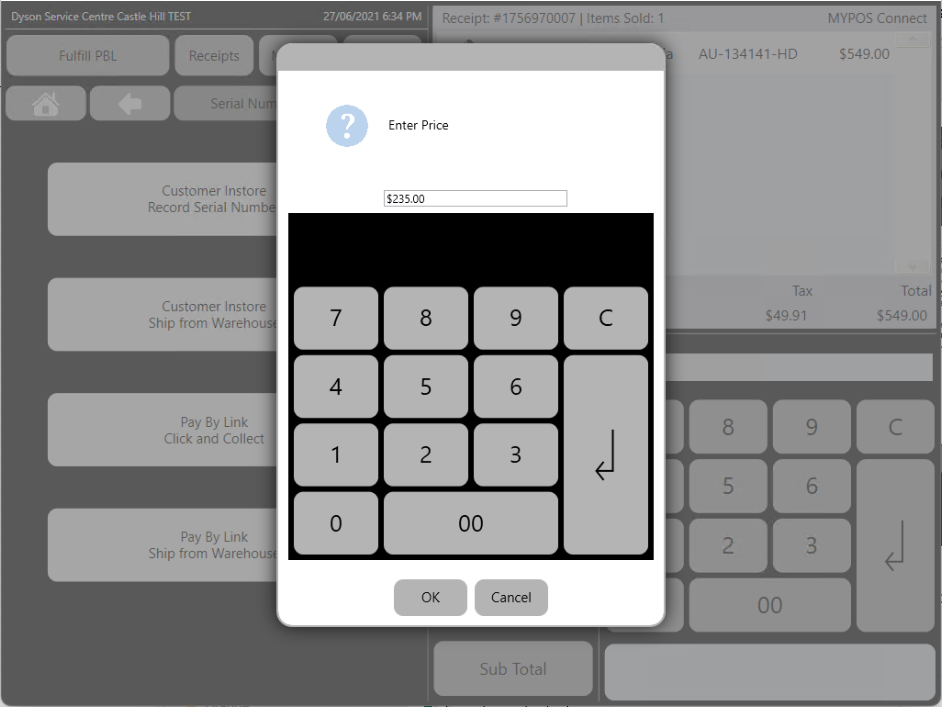 To Apply a Price Override select the 'Price Override' button, if you have Price Override Permissions on your account you will then be able to type a price into the pop up and press 'ok' to change the price